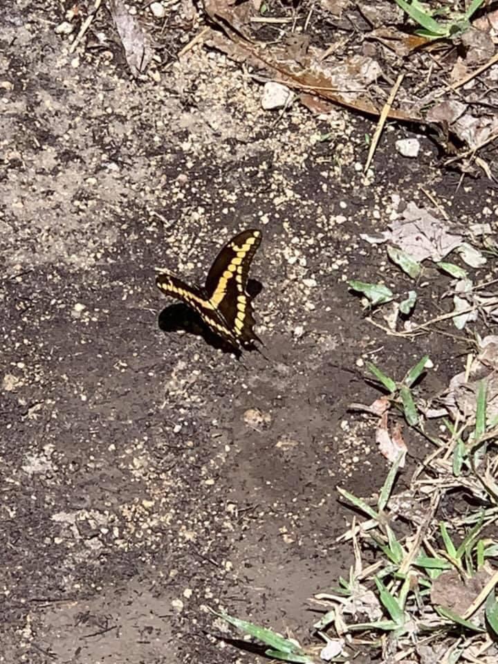Una mariposa revolotea bailando sobre el suelo humedecido
