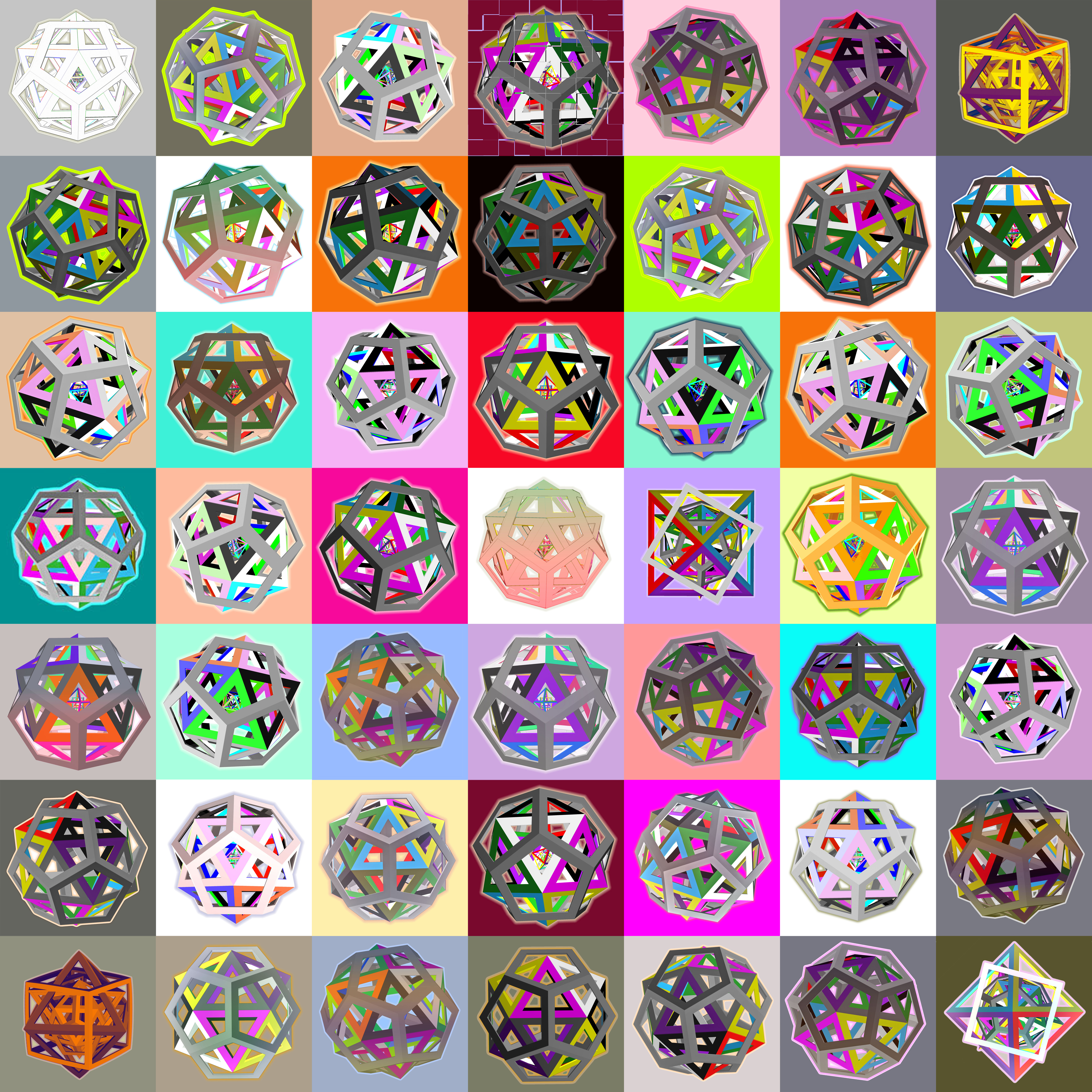 A partir de 2018 abandoné el médium del óleo para dedicarme a las pinturas digitales. Las pinturas digitales, impresas y manipuladas sobre lienzo, cuentan hoy con sesenta y cuatro imágenes. «Interacciones platónicas» utiliza cincuenta de éstas, ordenadas secuencialmente. Además, las organizo en dos mosaicos, uno de 5 x 5 cuadrados y el otro de 7 x 7 cuadrados (tal como se ve en la imagen 2 arriba).