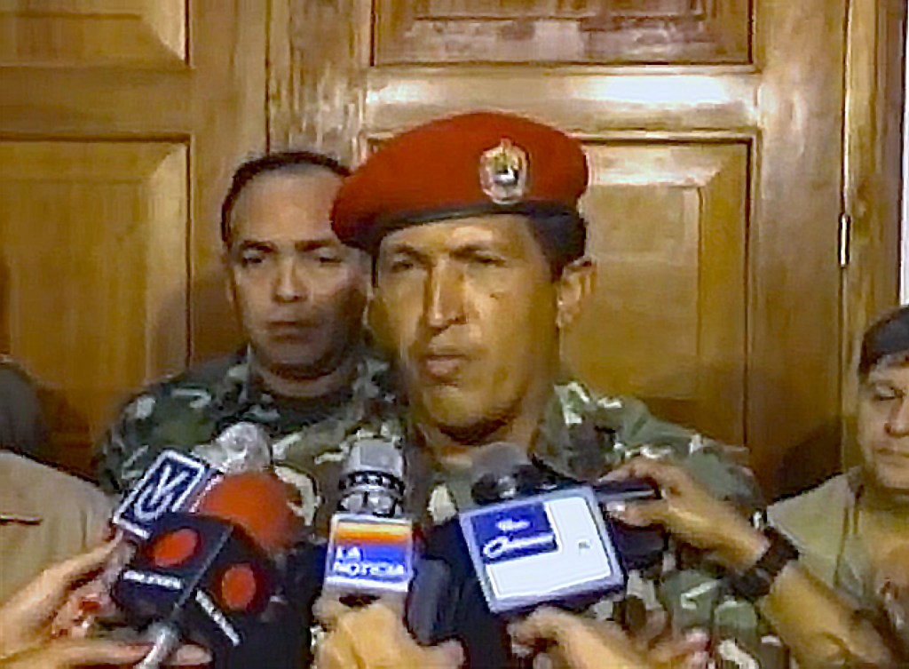 El 11 de abril de 2002, tuvo lugar una manifestación con más de un millón de personas. Marcharon hacia el palacio presidencial y exigieron la dimisión de Chávez. La protesta fue pacífica hasta que aparecieron agentes de la Guardia Nacional y paramilitares enmascarados. Dispararon contra la multitud. La llamada Masacre de El Silencio se cobró la vida de muchos manifestantes. Estos sucesos desencadenaron la sublevación de varias divisiones militares. Detuvieron a Chávez e instalaron un gobierno de transición bajo la dirección de Pedro Francisco Carmona Estanga. Al día siguiente, Carmona suspendió la Constitución para crear un nuevo orden. Disolvió la Asamblea Nacional y el Tribunal Supremo de Justicia. También destituyó al Fiscal General, al Contralor General y a los gobernadores y alcaldes. Sin embargo, en menos de 48 horas (el 13 de abril), el ejército cambió de estrategia y retiró el apoyo a Carmona. El capitán Diosdado Cabello Rondón fue restituido como presidente. Tras jurar su cargo, Cabello devolvió a Chávez al poder.