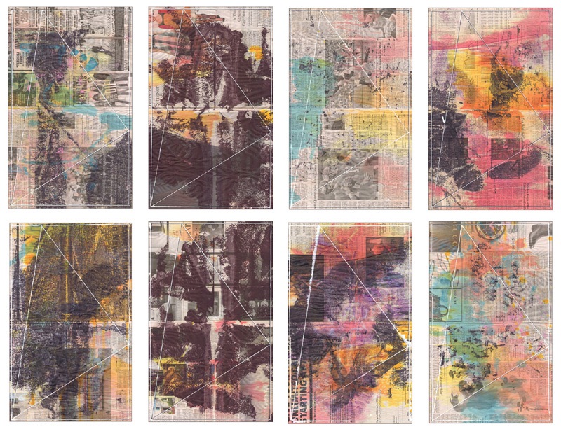 Tintas translúcidas, tinta sumi, corrector líquido y óleo absorbido sobre papel de periódico