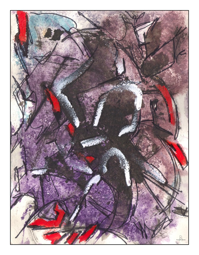 Acuarela, creyón de óleo, pluma sharpie negro y gesso sobre papel