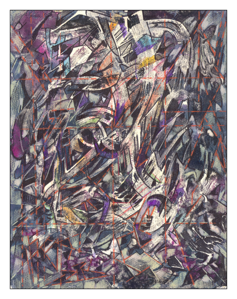 Acuarela, tinta sumi, creyones de cera, y gesso sobre papel